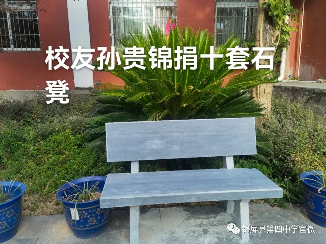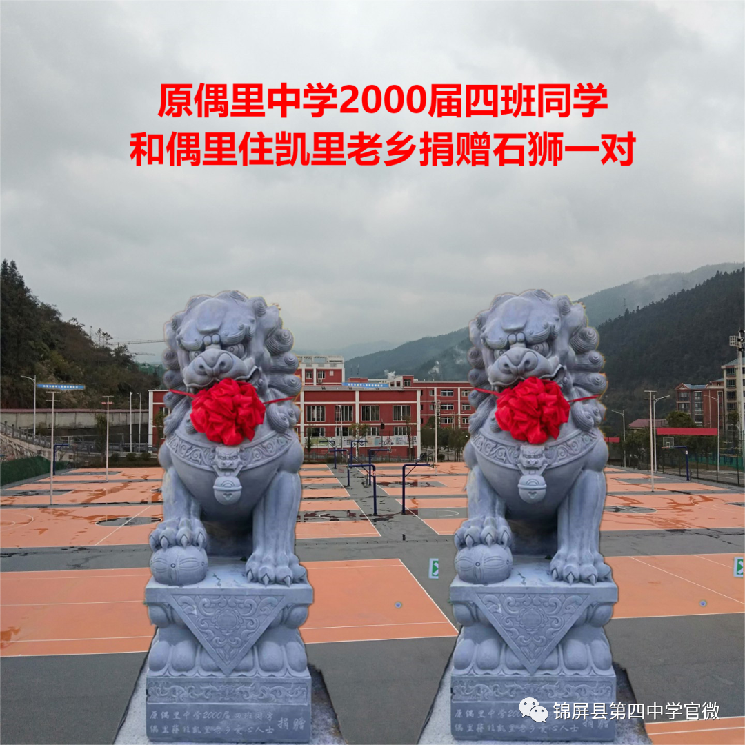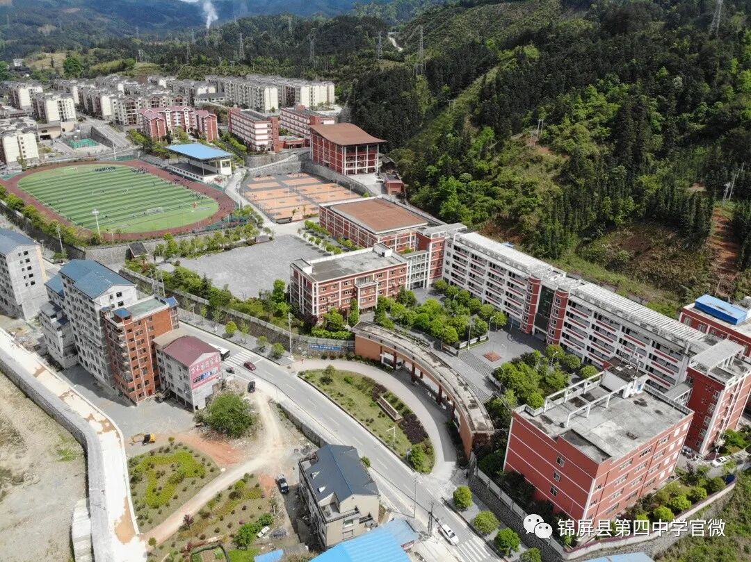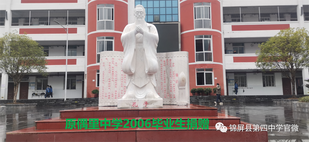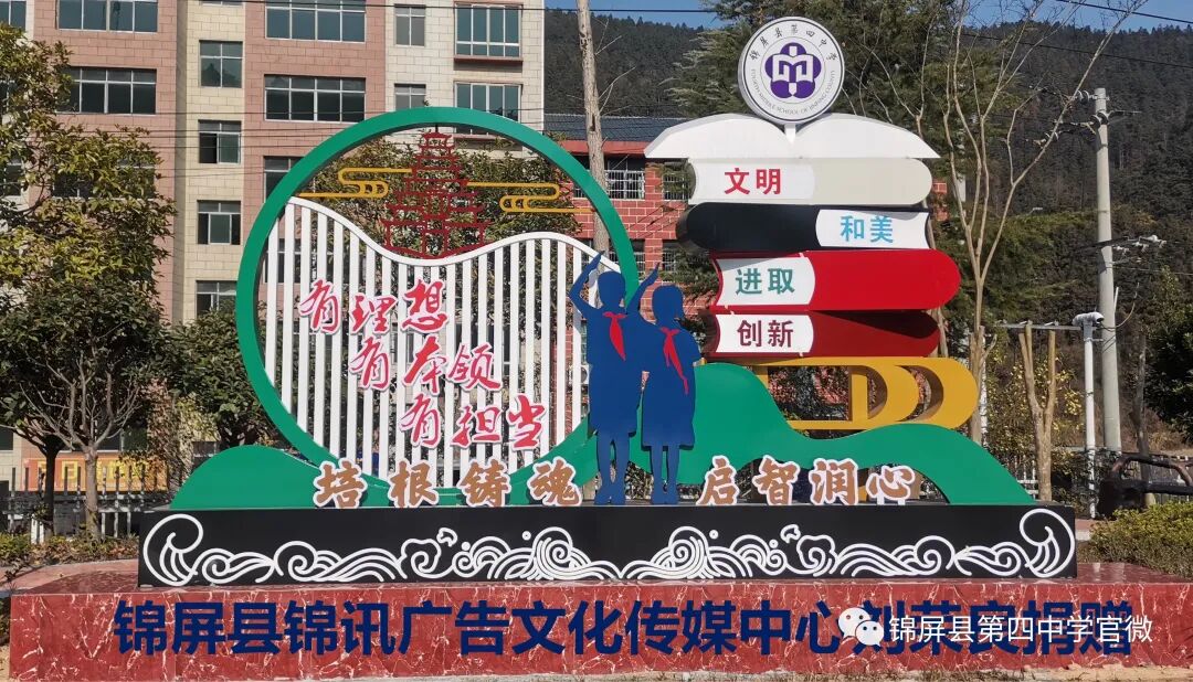 锦屏县第四中学创建于2018年2月,集锦屏县境内偶里、平略、大同、茅坪、平秋、彥洞六乡镇苗侗两千余子弟于此逐梦求学。空阔的运动场、明亮的教室、美丽的校园、崭新的校舍,四中学子徜徉于学海。然而,美中不足的是新校园里的校园文化却才跚跚起步,等待四中人奋进创建。近年来,学校领导联络各方热衷于教育事业的仁人志士为校园文化建设捐资捐物,到目前止已有校门石狮、麒麟、孔子雕像、凉亭、石桌、石凳、礼仪广场旁的精神堡垒、喷泉设施,还有铺在步道里的青石板。仁人们的善心为打造四中校园文化添砖加瓦,无异于锦上添花,四中学子亦籍“群文阅读”活动在校内掀起诵读国学经典热潮。