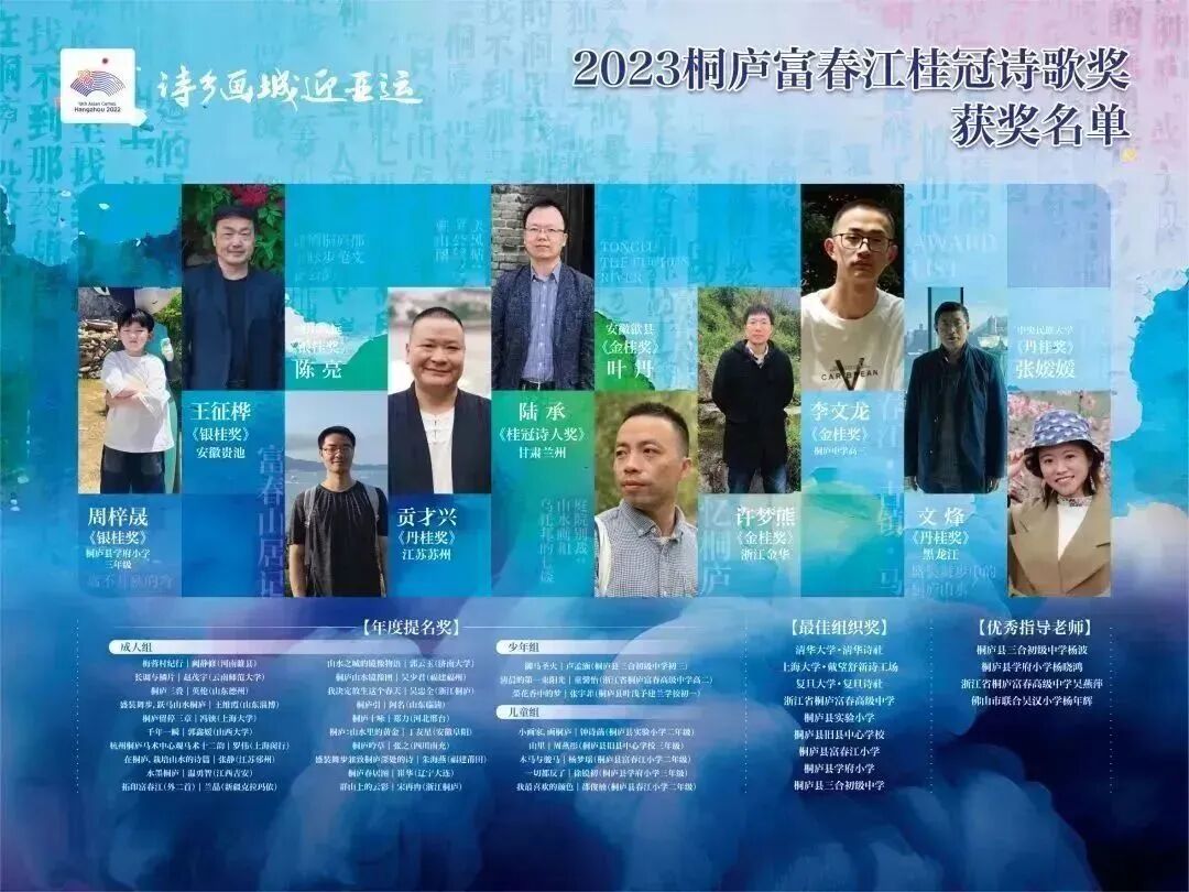 中国桐庐 富春江诗歌节 “诗乡画城迎亚运”,历时近3个月,2023盛装舞步·第二届中国桐庐富春江诗歌节落下帷幕,中国桐庐富春江桂冠诗歌奖全国创作大赛获奖名单也已出炉。5月22日,富春江诗歌节闭幕式将在县城中心广场举行,现场,我们将一睹获奖诗人的风采,也将迎来亚洲多个国家的诗人,在推进桐庐国际化视野的同时,也向各国诗人展示桐庐之美。 大赛收到了12588首