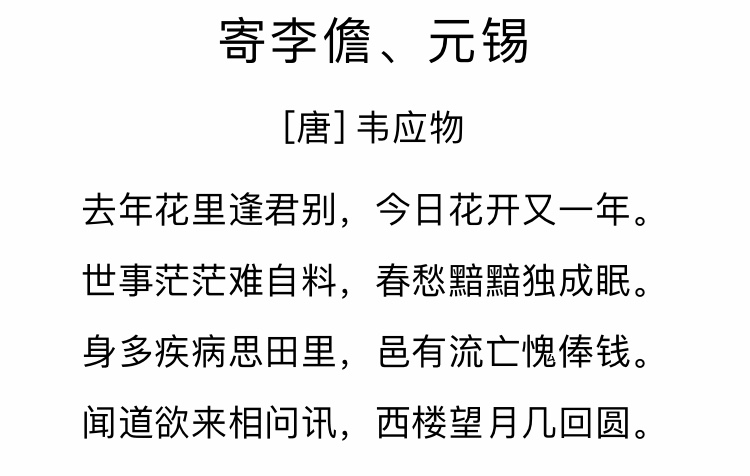 出身名门曾经民间有这样一句话“城南韦杜,去天尺五”,这句说的就是当时的韦家与杜家,虽然说到了韦应物这一辈,韦家的光芒已经开始比不上杜家,但是韦应物他的祖辈从当朝宰相,再到朝廷命官,无一不受皇帝重用,含着如此高贵的金汤匙出生的韦应物,自然是长安城里极为金贵的少爷。少年的时候不喜欢读书,更喜欢约上其他的富家子弟,在声色中纵情潇洒。到他15岁的时候,时常在宫闱出入,便做了唐玄宗的贴身侍卫。那个时候的他,因为有了双重身份,更是嚣张跋扈到了极致,他曾写过一首《逢杨开府》,这首所作的回忆诗就可以看到他过往的荒唐事。 《逢杨开府》 少事武皇帝,无赖恃恩私。 身作里中横,家藏亡命儿。 朝持樗蒲局,暮窃东邻姬。 司隶不敢捕,立在白玉墀。 骊山风雪夜,长杨羽猎时。 一字都不识,饮酒肆顽痴。 武皇升仙去,憔悴被人欺。 读书事已晚,把笔学题诗。 两府始收迹,南宫谬见推。 非才果不容,出守抚茕嫠。 忽逢杨开府,论旧涕俱垂。 坐客何由识,惟有故人知。