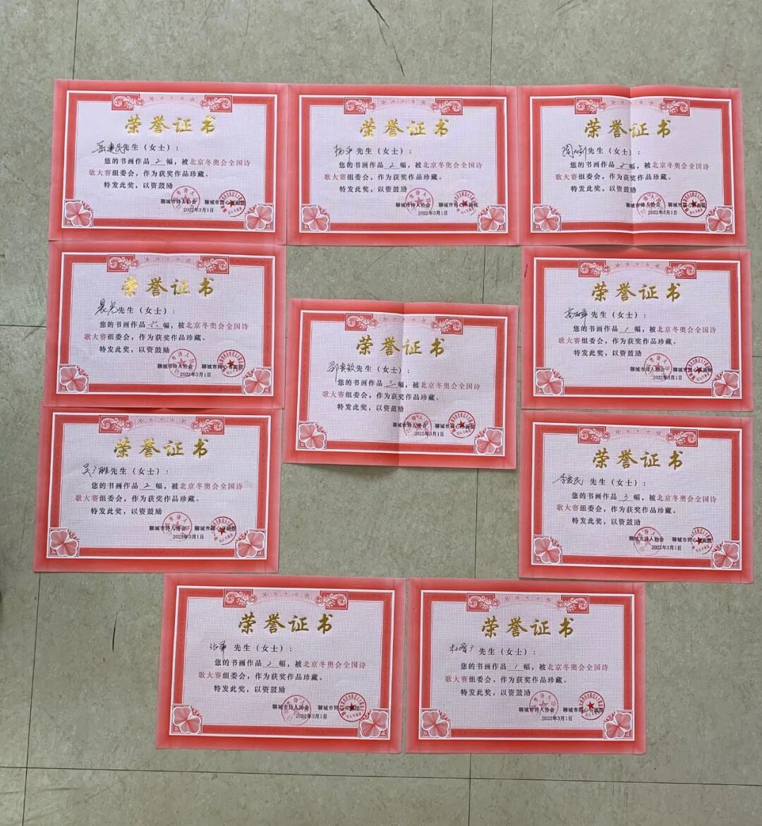 聊城市诗人协会“2022北京冬奥会”全国诗歌征稿大赛获奖名单出炉 “2022北京冬奥会”期间,聊城市诗人协会、《鲁西诗人》杂志举行的全国诗歌征稿,共收到应征稿件266份。这些征文作品,激情四射,文笔洒脱,再现了体育运动员的精神风貌,描述了冬奥赛场一个个精彩瞬间,展示了中国人民热情友善、开放包容的大国胸襟,颂赞了运动员英勇奋战、扣人心弦的拼搏精神。 2022年3月3日,聊城市诗人协会联合聊城新联会同心书画院的书画家,在聊城市新联会创新基地书画活动室挥毫泼墨,创作了一批精美的书画佳作,作为这次诗歌征稿大赛的奖品将于近期邮寄给获奖诗人。 本次大赛共评出获奖作品15份,名单如下: 聊城市诗人协会“2022北京冬奥会”全国诗歌征稿大赛获奖名单
