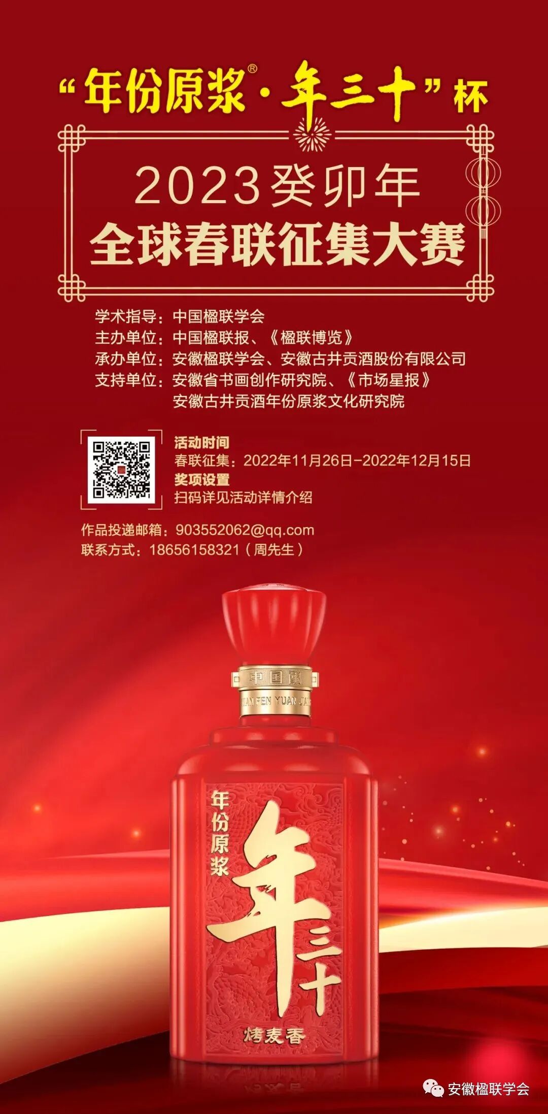 12月18日下午,“年份原浆•年三十”杯2023癸卯年全球春联征集大赛”终评工作,在合肥举行。 因疫情关系,终评评委中,中国楹联学会会长李培隽、安徽省楹联学会会长陈建国、古井集团副总裁杨小凡通过线上参加终评。评委卢晓、张家安、史培刚、唐佳、周玉冰、郏云海等参加了现场评审工作。古井贡酒品牌管理中心副总监胡侃评审前介绍了征集情况。 大赛发布海报 此次征联,由中国楹联学会指导,古井贡酒年份原浆特携手《中国楹联报》《楹联博览》、安徽省楹联学会,面向全球华侨、华人和各界友好人士,发起“一字千金!年份原浆•年三十杯全球楹联征集大赛”活动。活动得到学会专家们积极响应。中国楹联学会、《中国楹联报》《楹联博览》、安徽省楹联学会、中华楹联微信公众平台、联都公众号、合肥市楹联学会公众号等联界全媒体参与宣传,发布征联启事,利用资深资源,全国约500多个诗词、楹联群转发。协办单位《市场星报》及旗下的微信、掌中安徽、安徽财经网发布,更好地发挥了文化资源优势。从11月26日发布启事后,得到全球联家以及社会各界楹联爱好者的大力支持和踊跃参与。截至12月15日,组委会已收到3000余人投稿,12000多副作品。工作人员统计页码篇幅1112页,纯文字达28万多。 终评前的初评,从12000多副作品中进行第一轮初评,评出600多副作品。再经过两轮复评,评出240多副作品参与终评。
